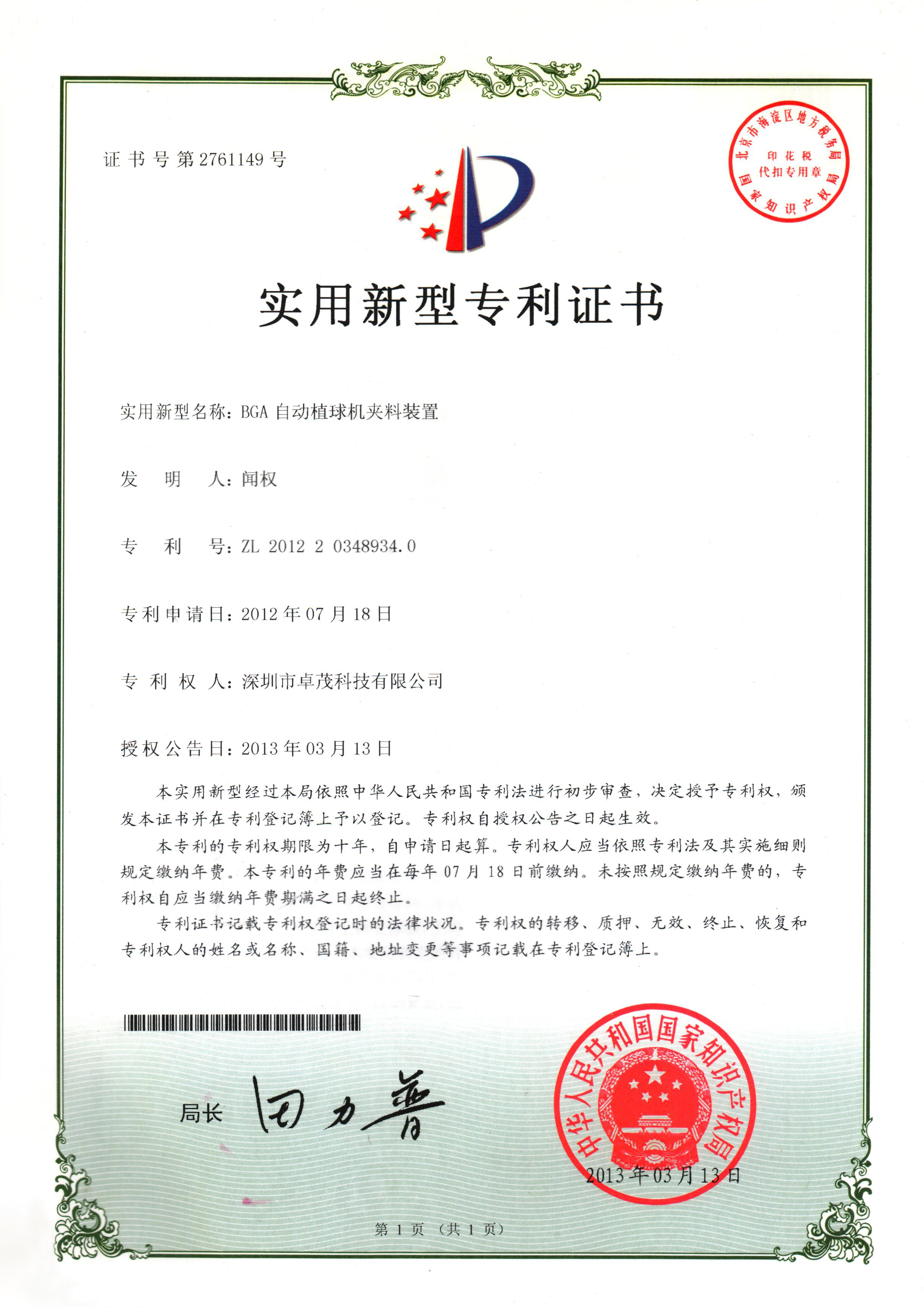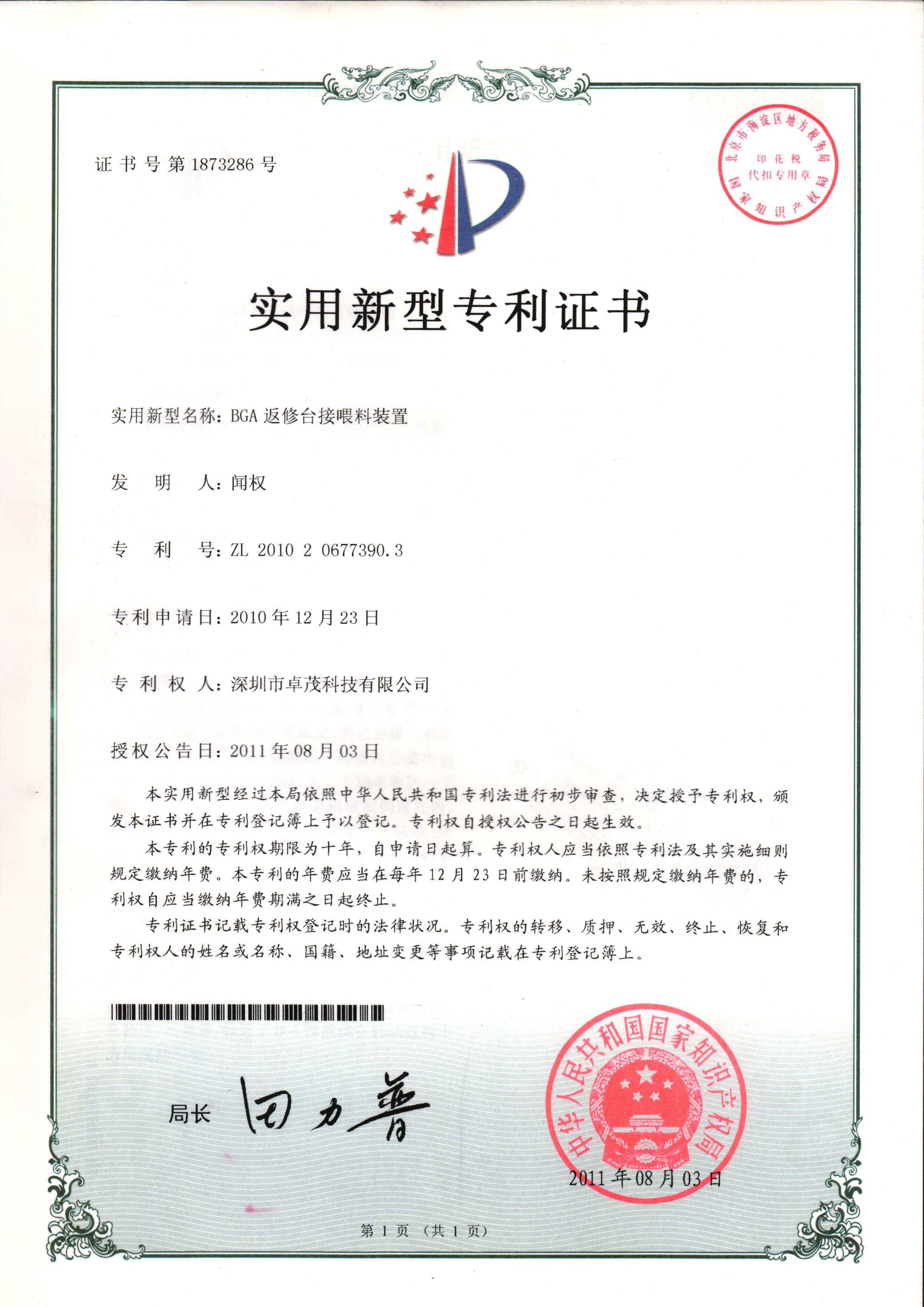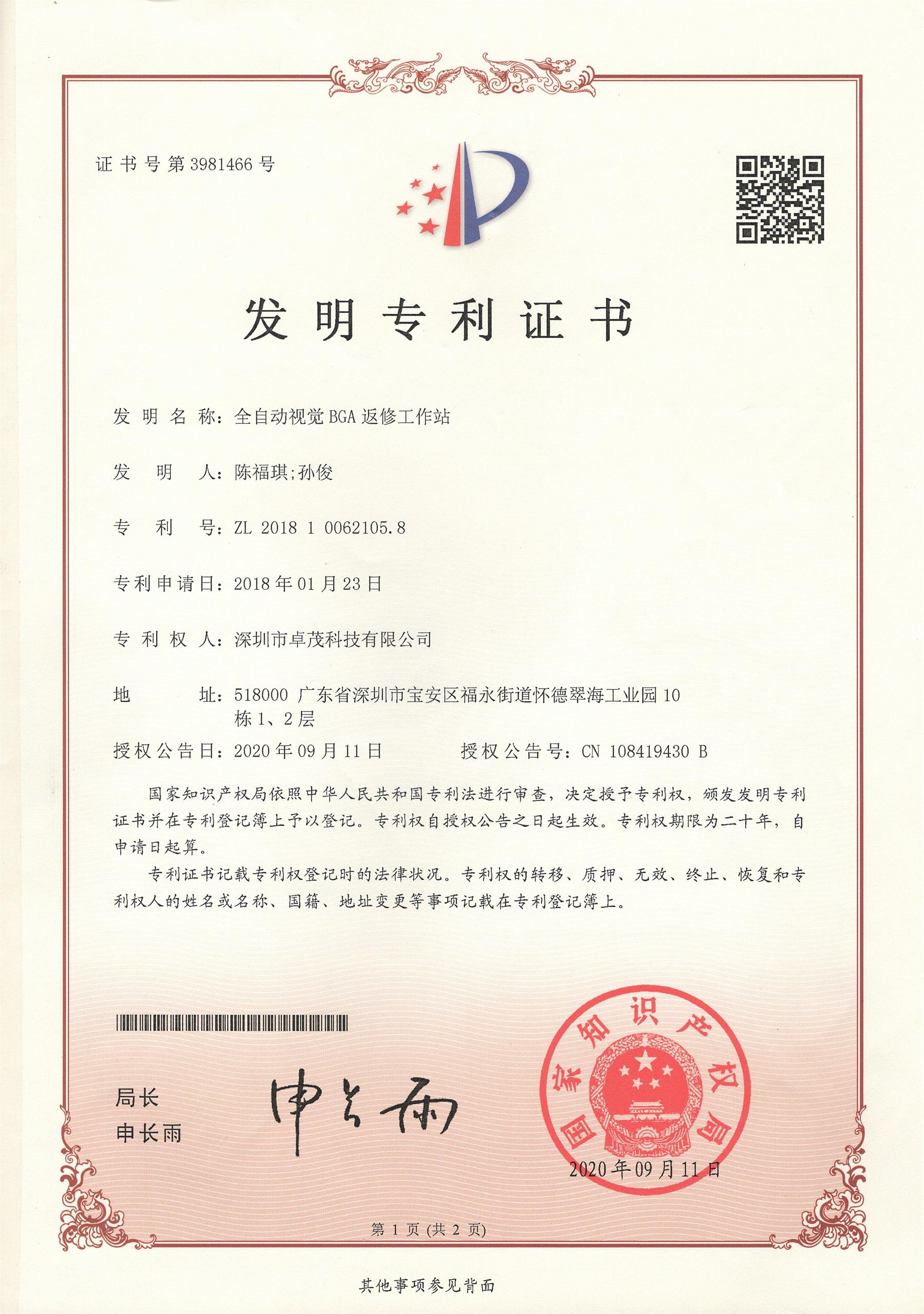 国内第一台全自动BGA植球机诞生并成功申请发明专利并获得授权