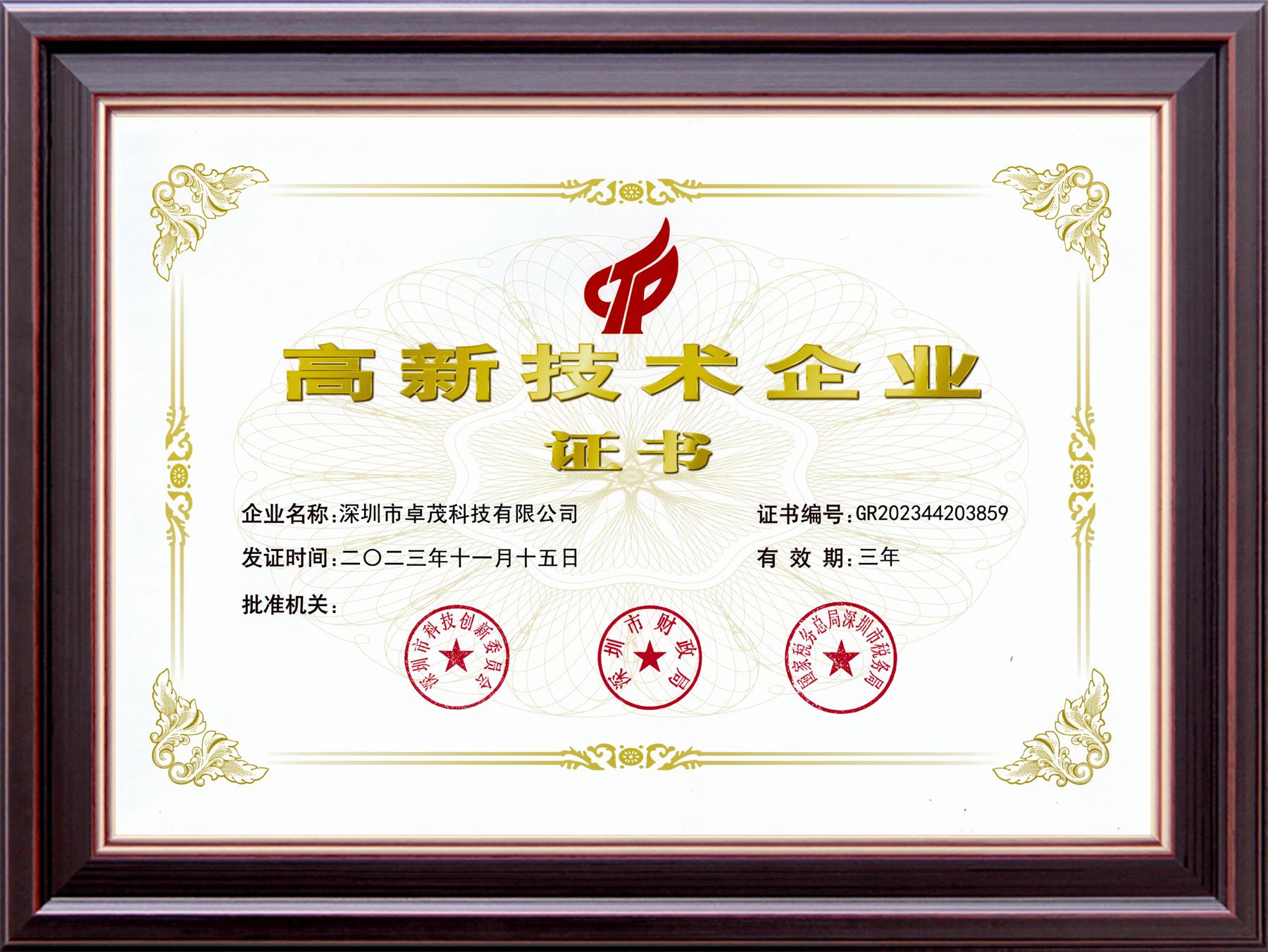 获得“国家级高新技术企业”证书