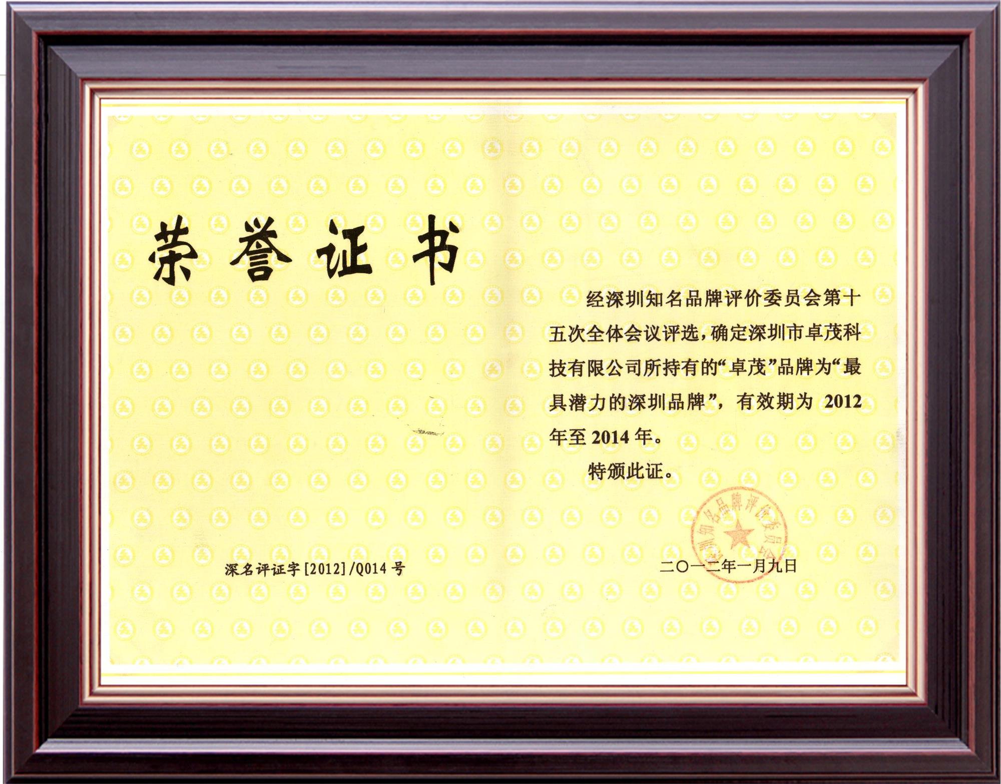 荣获第九届“最具潜力深圳知名品牌企业”称号